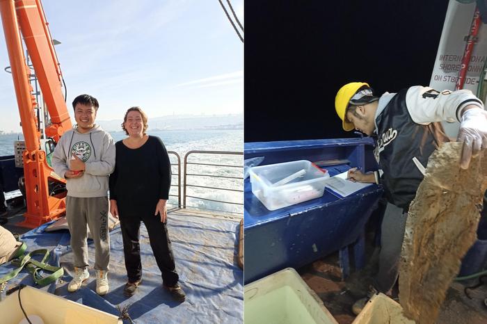 Left: Deep-sea research cruise conducted in 2022. Right: Onboard sampling activities and field observations during the expedition