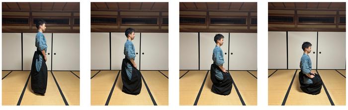 Rei-ho training by sitting down and standing up (a, c). Unlike a regular squat (b, d), it involves slowly lowering without leaning forward.