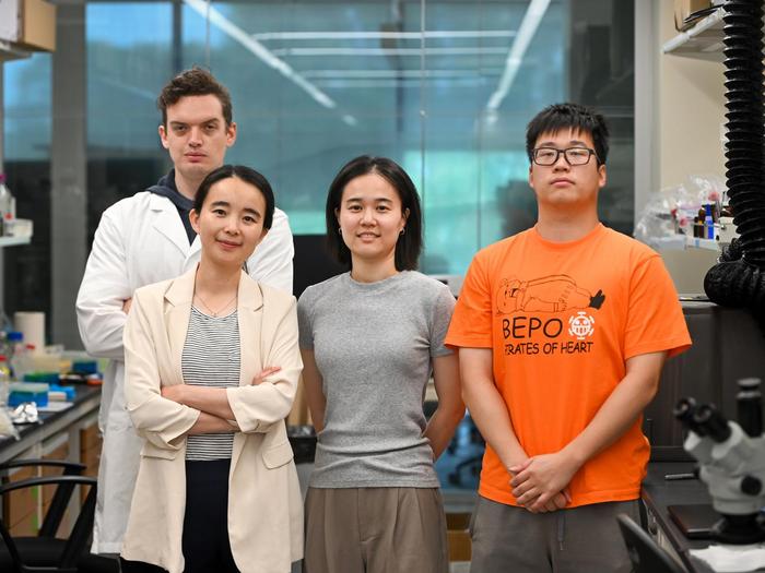 From left to right, biomedical engineering doctoral student Ethan Gerhard; co-corresponding author and Assistant Research Professor of Biomedical Engineering Su Yan; first author and biomedical engineering doctoral student Hui Xu; and biomedical engineering doctoral student Yuqi Wang pose in the lab. The team worked together to create the bone growth scaffold CitraBoneQMg.