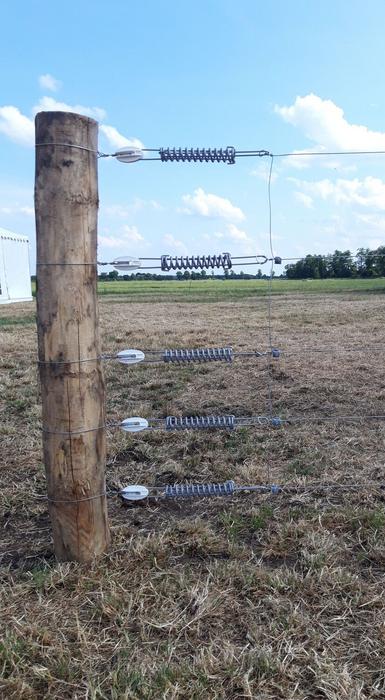 Wolf-repelling fence for fields where cattle graze: an electric fence with five sturdy strands of wire is the design used here to prevent wolves from getting into the pastures.