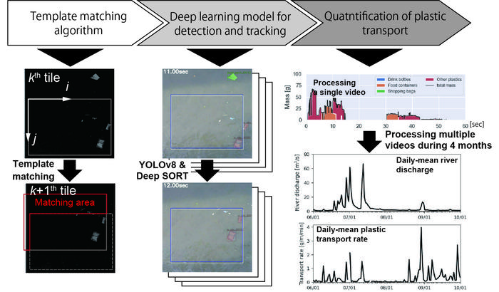 By applying three image and computational processes to a series of continuously captured videos, this method reveals how plastics are transported in rivers. (1) Flow velocity is measured using template matching. (2) Plastics are detected and classified into four categories by the object detection AI YOLOv8, and each item is tracked using the AI DeepSORT. (3) The measured flow velocity and tracking results are combined to calculate plastic transport volume—the number and mass of plastics carried per unit time.