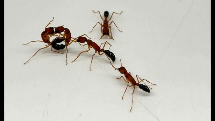 Ants that lack antennae and cannot smell fighting their nestmates.