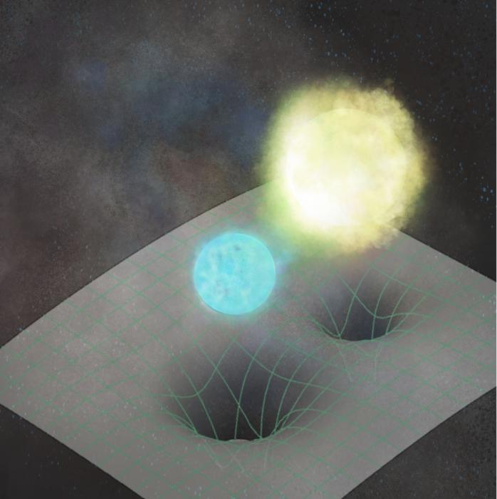 Impression of the 6.9 minute double white dwarf binary J1539+5027, composed of a tidally heated white dwarf (yellow) and its more compact companion (blue). It is about to start mass transferring.