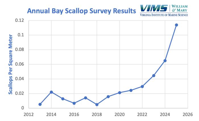 The VIMS ESL’s 2025 Bay Scallop Survey documented an average density of 0.114 scallops per square meter, with researchers routinely finding multiple scallops within a single square meter — something unimaginable just a few years ago. With the recent trend of progressive growth, researchers estimate the population will double in less than 1.5 years.