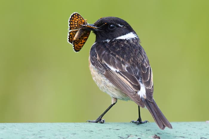 The Saxicola rubicola bird eating a moth