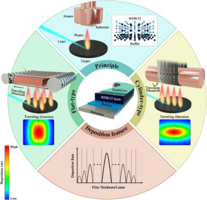 Schematic of conventional lab-scale, static PLD facility and epitaxial growth of REBCO (upper panel), schematics of flat-plate and cylinder-type PLD and corresponding growth rate distribution over the deposition zone (left panel and right panel, respectively), the common deposition feature of MPMT-PLD process (below panel), and the typical configuration of REBCO CCs is shown in the center panel.