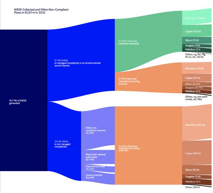 Of the 10.7 Mt of WEEE generated in 2022, only 5.7 Mt (54%) were collected and appropriately treated in a compliant manner, i.e. in accordance with EU regulations, such as the WEEE Directive. These volumes were collected through retailers, municipal collection points, and commercial collection companies. Following treatment, approximately 0.4 Mt of critical raw materials were successfully recovered, including, among others, 162 kilotons (kt) of copper, 208 kt of aluminium, 12 kt of silicon, 1 kt of tungsten, and 2 t of palladium. Precious metals such as gold and silver, along with steel and other ferrous materials, were also recovered. However, despite compliant collection and treatment, 0.1 Mt of critical raw materials were not recovered, mostly rare earth elements e.g., neodymium, dysprosium, yttrium, and europium, which are vital materials found in magnets, fluorescent powders, and electronics. The remaining 46% of WEEE, about 5.0 Mt, is not compliantly collected or treated, increasing the chance of losing valuable materials and releasing hazardous substances into the environment. The largest quantity, 3.3 Mt, falls under other non compliant recovery, including WEEE mixed with metal and plastic waste, where only some materials, such as iron or steel, may be recovered, often at lower standards. Another 0.7 Mt is discarded with residual solid waste and sent to landfill or incineration. Approximately 0.4 Mt is exported for reuse. The remaining share is undocumented, likely either exported illegally or processed through informal or unregulated channels.