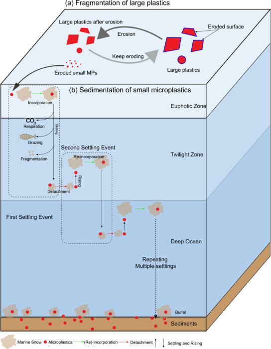 Using a model that simulates the slow breakdown of large plastic particles and their interaction with marine snow (sticky organic material that helps transport debris to the deep sea), the researchers show that the degradation process is the limiting factor in removing plastic from the surface.