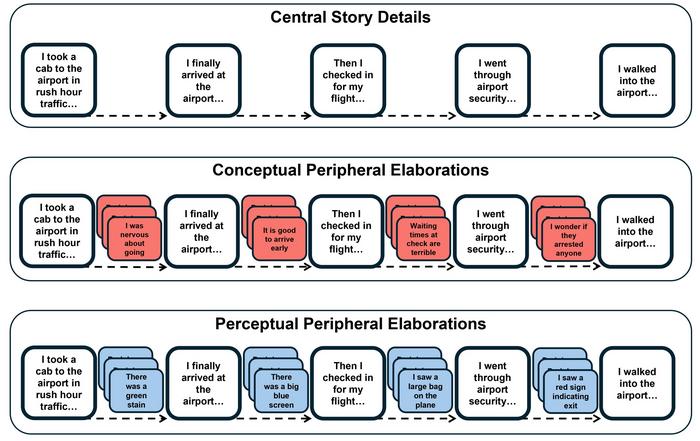 This image depicts different “Taking a Flight” narrative stimuli used in an experiment. While central details were consistent, peripheral elaborations were different. Conceptual versus perceptual elaborations trigger different memory recall mechanisms later.