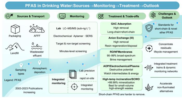 The study also provides an overview of PFASs' sources, transport, analytical detection, and mitigation in drinking water. Major pathways for PFASs' entry into water sources include surface runoff, soil leaching, and atmospheric deposition. While traditional analysis relies on liquid chromatography–tandem mass spectrometry, new portable high-selectivity sensors are emerging. Current removal strategies such as activated carbon, ion-exchange, membranes, and advanced oxidation processes, involve notable cost-performance trade-offs.