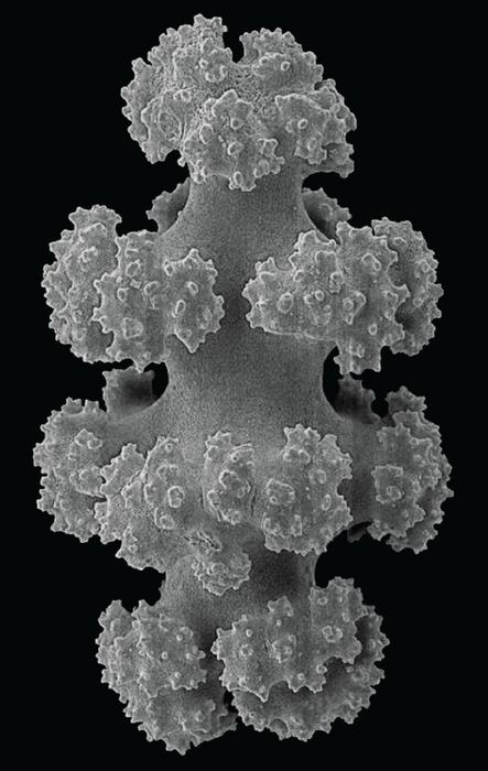 Measuring about a tenth of a millimeter in size, the particles are somewhat cylindrical, like a rod studded with branching outgrowths at regular intervals. “Once the sclerites get close enough to their neighbors, their branches jam together, holding them in place,” explains Hu.
