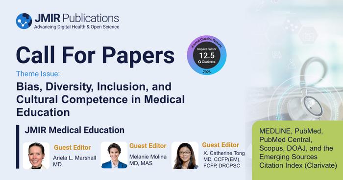 (Toronto, October 27, 2025) JMIR Publications invites submissions to a new theme issue in its premier open access journal JMIR Medical Education titled "Bias, Diversity, Inclusion, and Cultural Competence in Medical Education." The open access journal is indexed in MEDLINE, PubMed, PubMed Central, Scopus, DOAJ, and the Emerging Sources Citation Index (Clarivate) and received a Journal Impact Factor of 12.5 according to the latest release of the Journal Citation Reports from Clarivate, 2025.