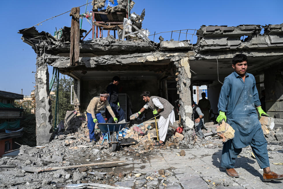 Workers remove debris from a house damaged after a a suspected air strike in Kabul. © Wakil Kohsar, AFP