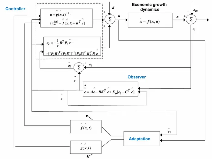 The proposed adaptive control scheme intelligently combines a feedback controller, a state observer, and a real-time learning algorithm to stabilize the economic growth dynamics.
