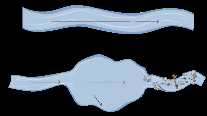 Previous theories have assumed that water, sediment and plant seeds move freely downstream (top image). However, lakes and rapids can become natural barriers where water can be slowed down as well. The solid lines show high transport or dispersal, and the dotted lines show reduced transport due to natural barriers.
