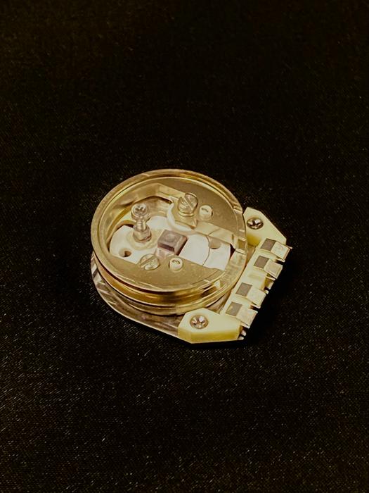 Stanford researchers placed this sample holder (approximately 1-inch diameter, bottom view) containing an anode after battery operation into the X-ray photoelectron spectroscopy tool for thorough analysis of the anode’s flash-frozen, pristine protective layer at cryogenic temperature. | Ajay Ravi