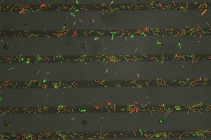 Researchers used paths of artificial sugar to study how bacteria sense their environment while forming communities. Red and green show two different chemical signals inside the bacteria.
