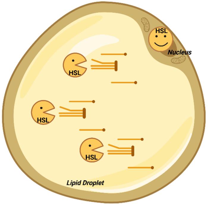 HSL contributes to the mobilization of fats stored in the lipid droplet. In the nucleus, HSL ensures the proper functioning of the adipocyte.