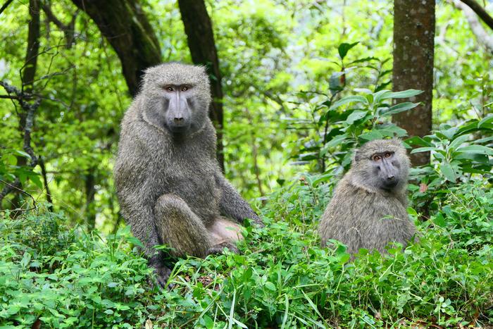 Male and female olive baboon (Papio anubis) in Bwindi Impenetrable Forest.