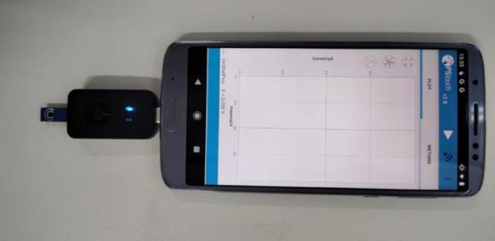 Device connected to a cell phone’s USB port: tested with the substances AB-Chminaca and MDMB-4en-Pinaca, two of the most common and dangerous synthetic cannabinoids, the device demonstrated its ability to detect very low concentrations