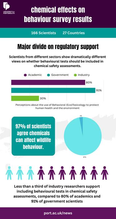 Less than a third of industry scientists support including behavioural tests in chemical safety assessments, compared to 80 per cent of academics and 91 per cent of government scientists