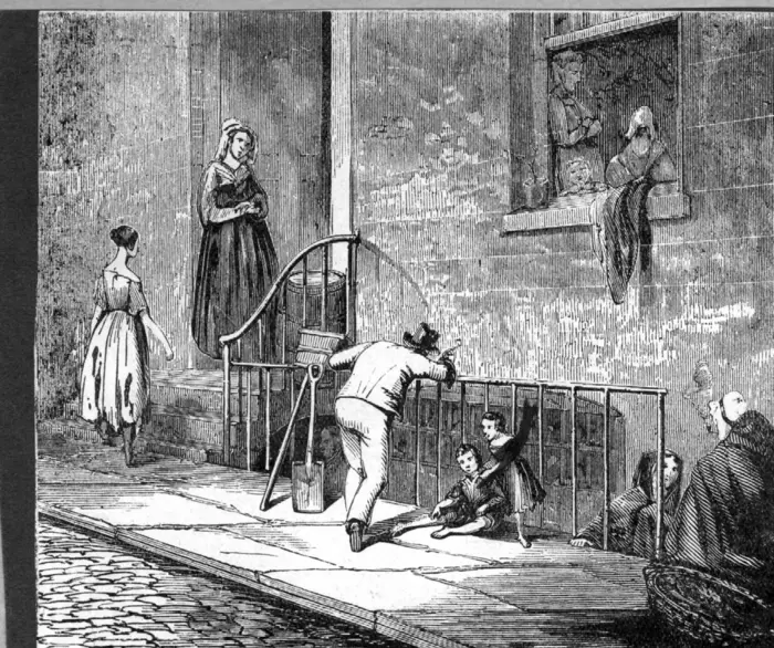 An 1838 print showing people in and outside a terraced house in Manchester, above and below street level.