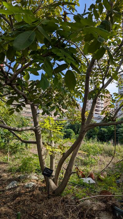 The Manchurian walnut tree (Juglans mandshurica Maxim.) in Kyushu University's herbal garden. Researchers studied its leaf extracts in their search for eco-friendly herbicides.