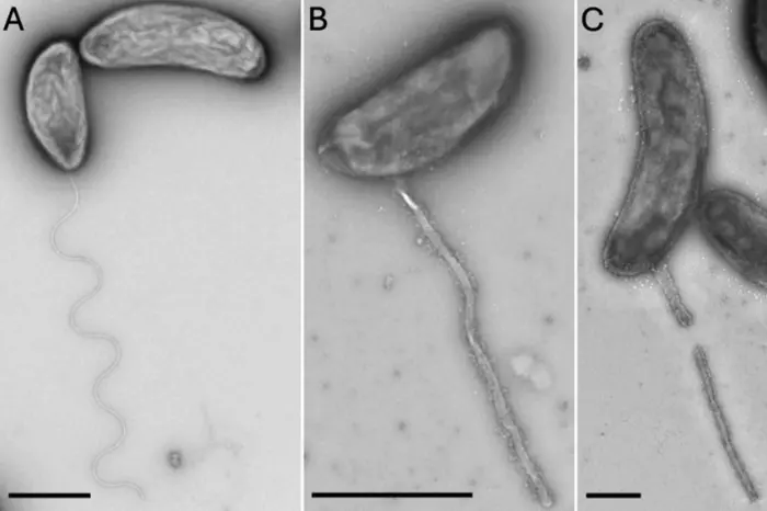 Microscopic images of the newly discovered bacterium, Caulobacter inopinatus. (A) A single cell with a tail-like flagellum used for swimming. (B, C) Cells that have attached to a surface with stalk-like extensions.