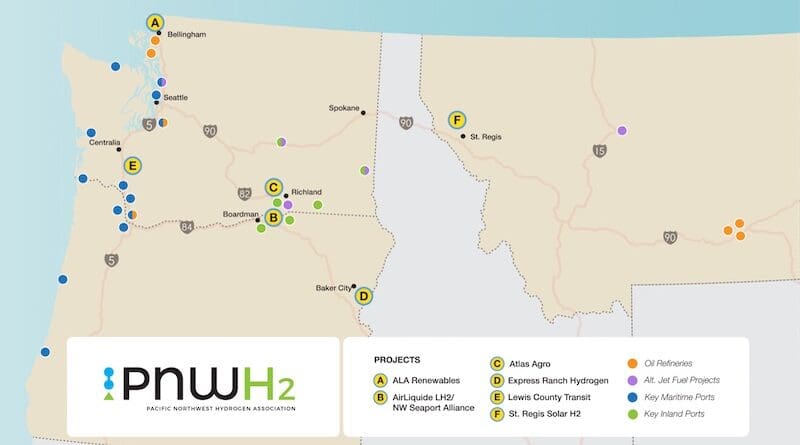 The Pacific Northwest Hydrogen Hub had six project “nodes” at the time the Trump administration terminated its federal funding. Credit: PNWH2 Hub