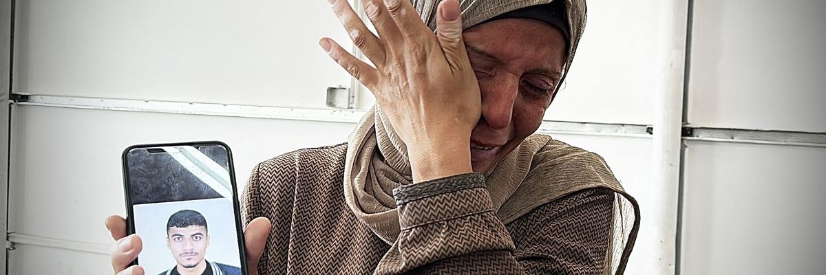 A woman holds up a mobile phone showing a picture of a family member at Nasser Hospital in Khan Younis, Gaza, on October 16, 2025, when medical teams reported signs of torture and abuse on many of the bodies returned by Israeli forces after a ceasefire was agreed to in Gaza.