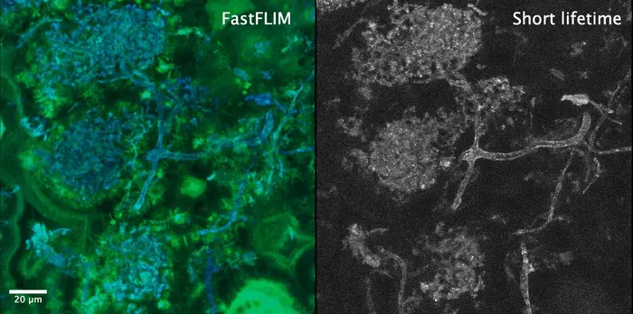 FLIM returns fluorescence lifetimes that emphasise different features of the plant and fungal structures