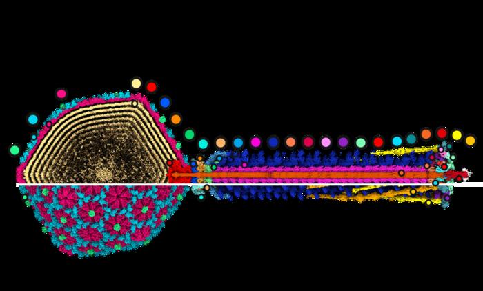 High resolution cryo-EM mapping of bacteriophage tail, with different proteins depicted in different colors.