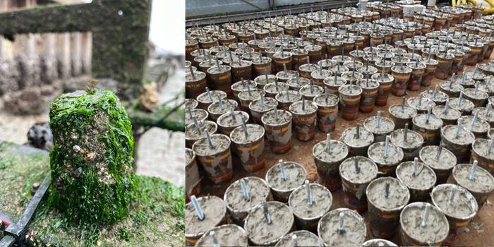 Coffie cup shaped blocks of Xiriton are covered with life after a year