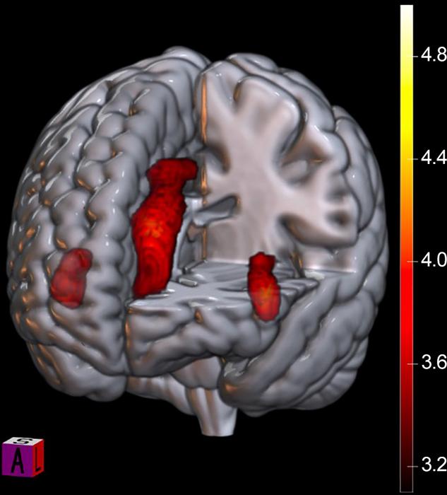 Rendering of the negative effect of significant defeat. The salience network is deactivated during a significant defeat. Color bar represents Z values (warmer colors indicate higher positive Z value, cooler colors indicate negative/relative deactivation). A = anterior, L = left, S = superior.