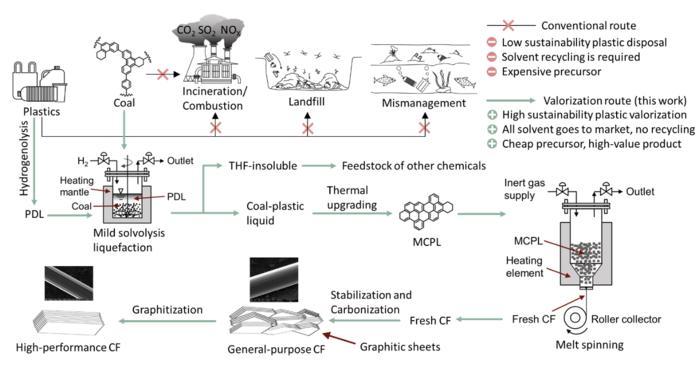 Waste plastics are hydrogenolyzed and served as the solvent for coal liquefaction. The liquefied coal is fabricated into carbon fibers. This process shows a sustainable pathway to avoid pollution and valorize both coal and waste plastics.