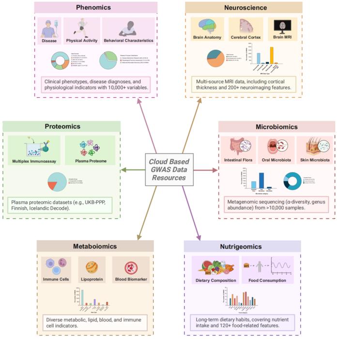 The diagram illustrates a framework for cloud-based GWAS data resources, structured in a hub-and-spoke architecture with "Cloud-Based GWAS Data Resources" at its core—interconnected with six multi-omics domains. Phenomics domaincontains disease-related data, physical activity metrics, and behavioral characteristics. Research purposes are classified as disease mechanism research, physiological function assessment, and molecular biomarker discovery. This domain provides clinical phenotypes, disease diagnoses, and physiological indicators, encompassing over 10,000 variables. Neuroscience domainintegrates multi-source neuroimaging data, focusing on brain anatomy, cerebral cortex, and brain MRI. This domain includes cortical thickness measurements and more than 200 neuroimaging-derived features, supporting genome-wide association studies across .various MRI data types (as illustrated by the accompanying bar charts). Proteomics domainprovides plasma proteomic datasets quantified through multiplex immunoassay techniques, covering major studies such as the UKB-PPP, Finnish, and Icelandic Decode cohorts. Represented ancestral groups include European and East Asian populations. Microbiomics domaincovers intestinal flora, oral microbiota, and skin microbiota derived from metagenomic sequencing of over 10,000 samples. Analyses include α-diversity measurements and genus abundance profiling. Metabolomics domain incorporates a wide range of metabolic and immune profiling data, featuring multiple analytical categories including immune cells, lipoprotein, and blood biomarker. Nutrigenomics domaincontains long-term dietary habit data including dietary composition and food consumption patterns. This domain covers multiple food categories including fish, meat, and other dietary components. This domain provides over 120 food-related features for diet-genotype interaction studies. Each domain is visually differentiated by color coding for clear identification.