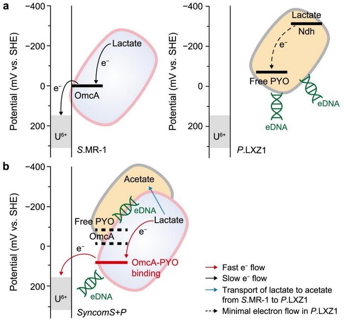 A research team has developed a synthetic microbial consortium that completely reduces soluble uranium [U(VI)] to insoluble U(IV) within 48 hours, showing nearly twice the efficiency of a single-strain system. The study reveals how Shewanella oneidensis MR-1 and Pseudomonas aeruginosa LXZ1 cooperate to accelerate extracellular electron transfer (EET). P. aeruginosa LXZ1 secretes pyocyanin, which interacts with the outer-membrane cytochrome OmcA in MR-1, while its extracellular DNA forms conductive networks within the biofilm. These mechanisms jointly enhance electron flow and energy metabolism, overcoming the limitations of conventional microbial reduction. The findings highlight a community-based approach for sustainable uranium bioremediation.