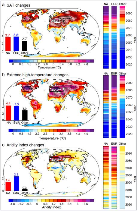 Although GHG are distributed relatively uniformly worldwide, the warming and climate effects they trigger exhibit significant regional differences. This phenomenon is closely linked to local climate backgrounds and feedback processes activated by rising temperatures. Our study clearly reveals that if GHG emissions remain uncontrolled, North America and Europe will experience warming amplitudes of 3.7°C ± 0.7°C and 3.8°C ± 0.5°C, respectively, by the end of the 21st century—significantly higher than the global average warming level of 2.7°C ± 0.4°C. Concurrently, the extent of drought in these two regions is projected to expand by 45.9% ± 11.9% and 13.4% ± 6.7%, respectively, highlighting the regional concentration and severity of extreme dry-hot trends.