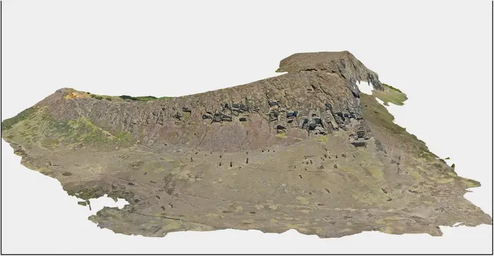 Three-dimensional model of Rano Raraku quarry produced through Structure-from-Motion photogrammetry. This comprehensive digital documentation, derived from 11,686 UAV images, reveals the complex spatial organization of production activities distributed across multiple workshop areas.