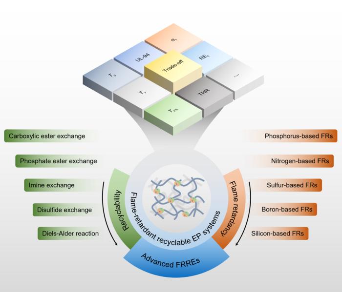 Research teams from Swinburne University of Technology and University of Southern Queensland have provided a deep overview of the current state of the art of fire-retardant recyclable epoxy systems (FRREs) based on covalent adaptable networks. By integrating dynamic covalent bonds (DCBs) and flame-retardant groups into the epoxy crosslinking network can effectively improve fire safety and recyclability. However, how to balance the recyclability, flame retardancy, and network stability of FRREs remains a key challenge. This review provides valuable insights into the directional design of high-stability FRREs.