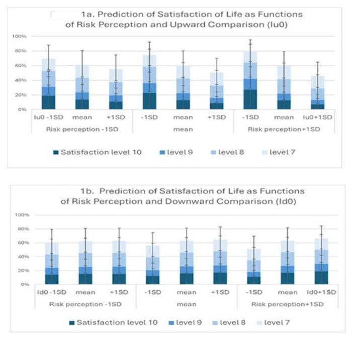 The figure illustrates how predicted probabilities of reporting life satisfaction levels 7–10 vary across low (−1 SD), average, and high (+1 SD) perceived national/societal risk. Panel 1a shows results stratified by upward social comparison (Iu0), while Panel 1b shows results stratified by downward comparison (Id0). Error bars represent 95% confidence intervals. Both forms of social comparison exert a stronger influence when perceived societal risk is high; and increases in risk generate steeper declines in predicted SWB in strong upward comparison, while keeping SWB level in strong downward comparison, indicating asymmetric psychological effects.