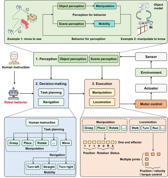 According to the process of robot behavior, we categorize Embodied AI into three modules: embodied perception, embodied decision-making, and embodied execution.