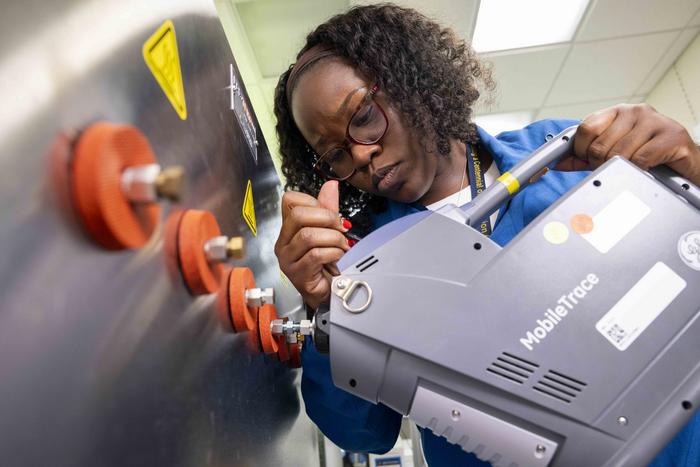 Ashley Fulton, Ph.D., U.S. Naval Research Laboratory research chemist, uses an ion mobility spectrometer to test a vapor generated from a trace explosive sensor testbed in Washington, D.C., Nov. 12, 2025. Fulton’s research explores the development of non-contact fentanyl detection to increase the safety of first responders. (U.S. Navy photo by Sarah Peterson)