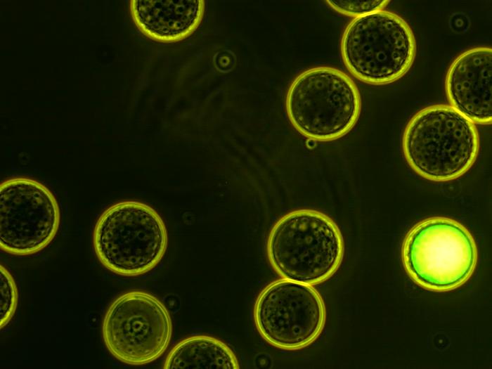 A micrograph shows several individual microcapsules including one, brightly lit one in the lower right corner, that contains amplified DNA from a single particle.