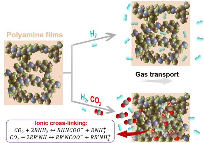 The study describes these phenomena with carbon dioxide (CO2) and a membrane made of crosslinked polyamines, which are a CO2-attracting polymer. Experiments and simulations show the crosslinked polyamines slowing CO2’s passage through the membrane.