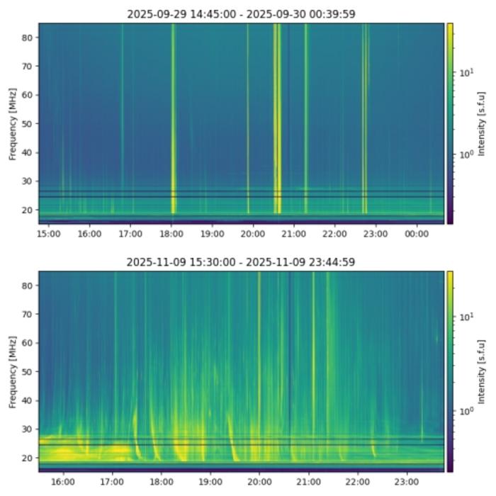 OVRO-LWA radio data contrasts a quiet day (Sept. 29, 2025) with the hours after the X1.7-class flare recorded at 2:35 ET on Nov. 9. The type III radio bursts, shown in the radio dynamic spectrum (horizontal axis is UT time, vertical axis is frequency), appear nearly vertical bursts during stable ionospheric conditions. After flare-driven X-ray and UV radiation ionized the lower ionosphere and geomagnetic storms driven by the associated coronal mass ejections, these radio bursts became curved and chaotic, particularly at low frequencies (bottom of the plot).