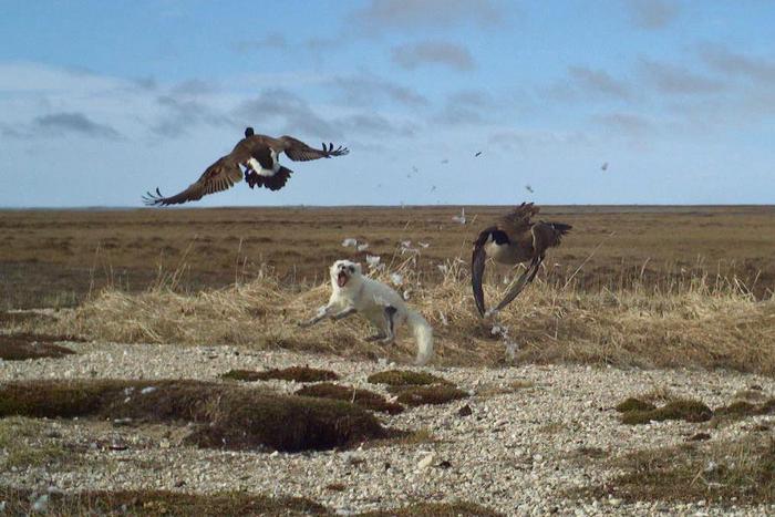 Research published in Ecology reveals that conditions favoring polar bears also favor Arctic foxes — with knock-on effects for their prey, like the Canada geese (and their nests) seen here.