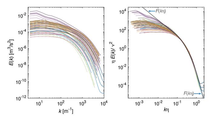 Right graph shows the same spectra rescaled by Kolmogorov’s general law, from which the -5/3rd law is derived, and which goes beyond the inertial range to include scales where energy dissipates into heat. Here, Kolmogorov predicted that energy spectra, rescaled using viscosity v and the smallest scale of motion η, become the universal function F(kη) at the small scales. The collapse of the rescaled data onto the universal curve F(kη), shown in gray, peeling off only at the extreme ends, demonstrates the small-scale universality of Kolmogorov’s framework across turbulent flows.