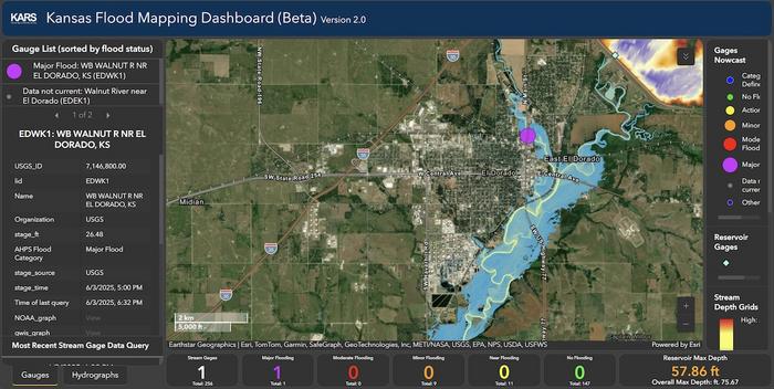 “A lot of people contributed to this project,” Kastens said. “My colleague Xingong Li, professor in the KU Department of Geography & Atmospheric Science, laid the groundwork for the real-time mapping, and we’ve had several researchers and graduate students involved over the years. KARS researcher and PhD student David Weiss is the lead architect of the current dashboard, which received praise from the Kansas Division of Emergency Management for its responsiveness and accuracy during severe spring flooding earlier this year.”