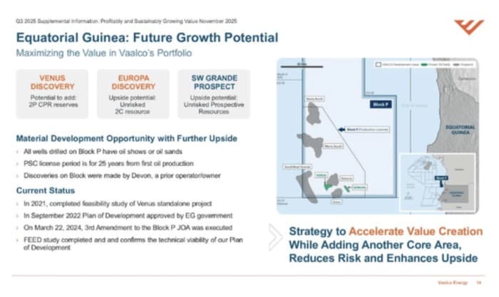 No catalyst discussion would be complete without at least a mention of EGY's 60% interest in Block P, offshore Equatorial Guinea. As of this date, a Plan of Development has been approved, and a Joint Operating Agreement is in place. Although Venus (Not to be confused with Total's Venus discovery offshore Namibia) As the slide below discusses, there is future prospectivity in this block. And the two producers and one injector needed to bring on Venus could be done in 2026.